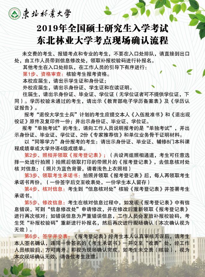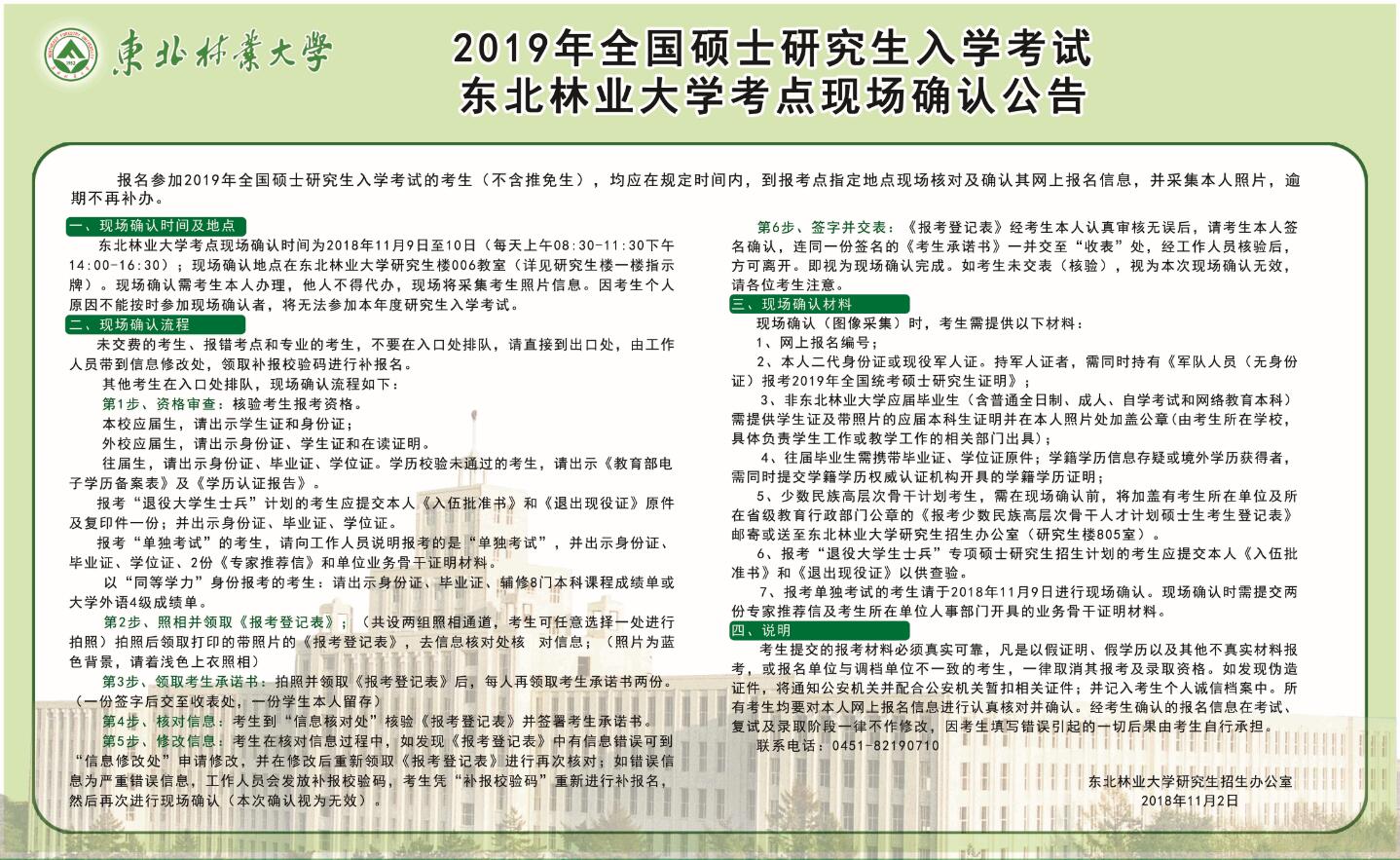 东北林业大学考点现场确认时间为2018年11月9日至10日(每天上午08:30-11:30 下午14:00-16:30);现场确认地点在东北林业大学研究生楼006教室(详见研究生楼一楼指示牌)。现场确认需考生本人办理,他人不得代办,现场将采集考生照片信息。因考生个人原因不能按时参加现场确认者,将无法参加本年度研究生入学考试。