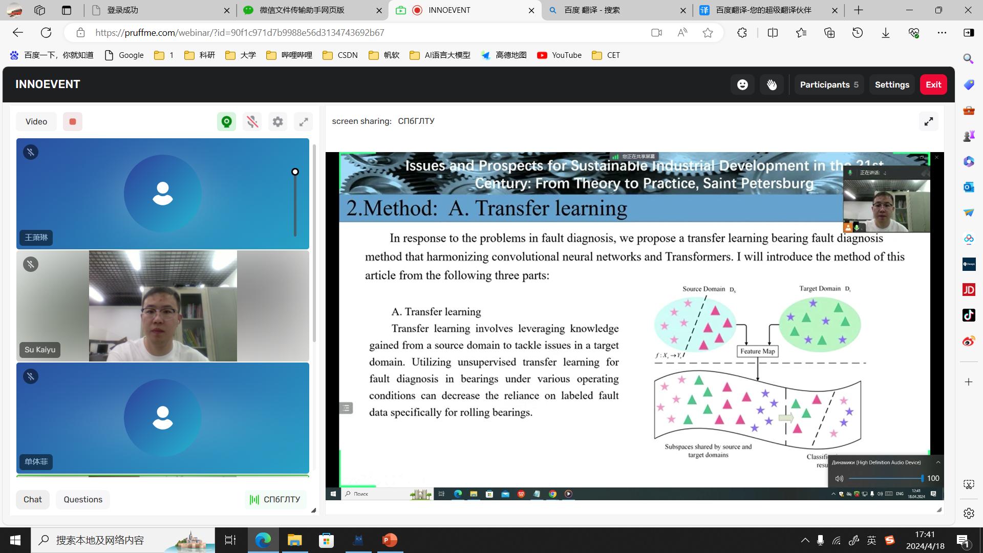 我校机电工程学院机械工程学科2022级硕士研究生苏凯宇在“外国实现可持续发展的主要方法”分会场做了题为《协调卷积神经网络和Transformer的增迁移学习轴承故障诊断方法研究》报告,苏凯宇在报告中提出了一种协调卷积神经网络和Transformer的迁移学习轴承故障诊断方法,为工业运行维护和早期轴承故障诊断提供了技术支持。轴承故障诊断方法作为智能工业故障诊断方法的一部分,从全新的角度为工业可持续化发展提出具体方案,推进现代工业朝着智能化、可持续的方向发展。我校苏凯宇同学充分展示了东北林业大学研究生风采,会后受到了圣彼得堡国立林业技术大学师生的高度赞扬。来自材料科学与工程学院、文法学院、化学化工与资源利用学院、土木与交通学院的研究生们通过参会,了解了中国、俄罗斯及其他国家可持续发展现状,收获颇丰。此次会议,活跃了中俄高校学术氛围,激发了我校研究生参与学术交流活动的热情,调动了研究生参与学术交流活动的积极性。