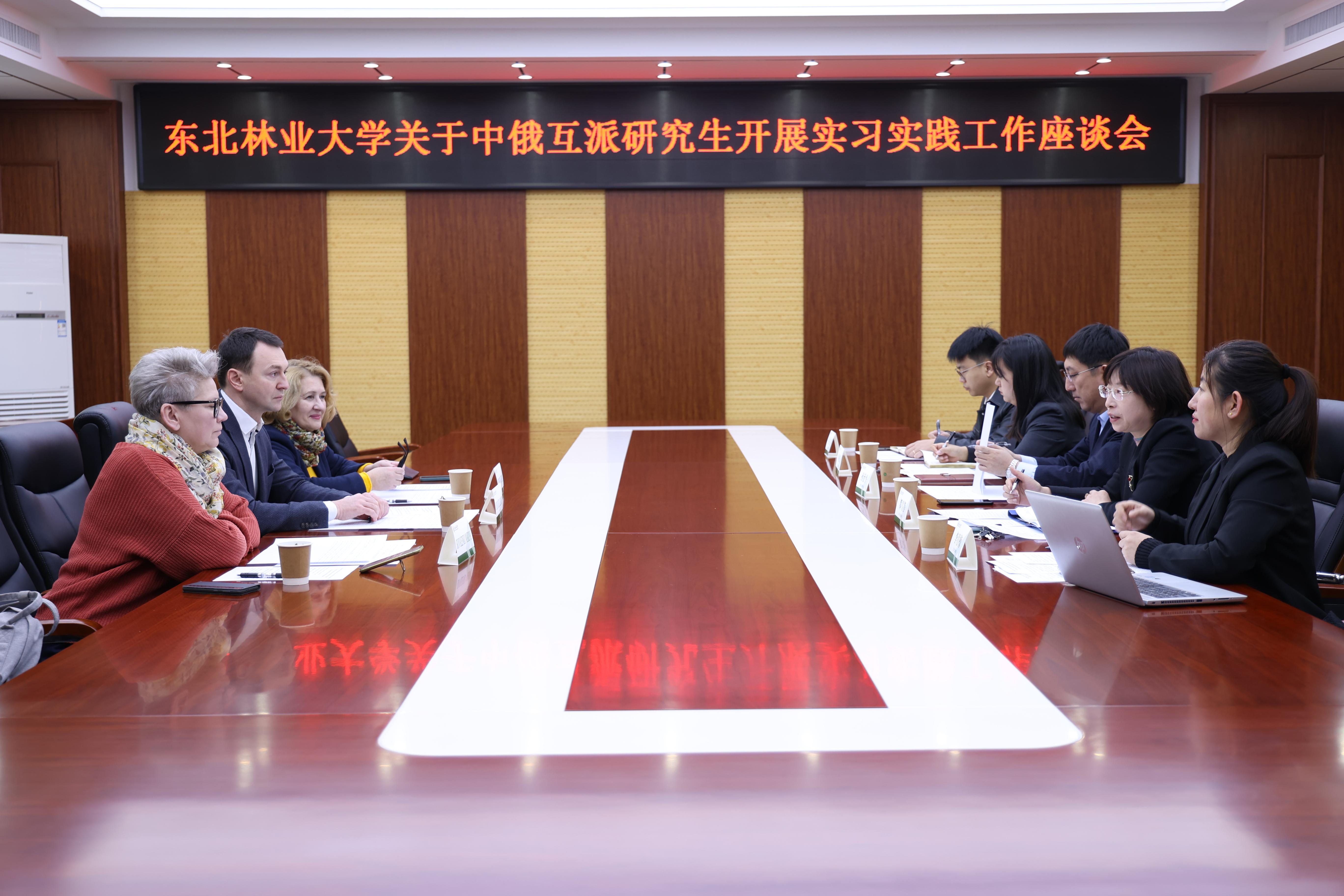 12月13日上午,研究生院在综合办公楼1008会议室组织召开东北林业大学中俄互派研究生开展实习实践工作座谈会。俄方代表圣彼得堡国立林业技术大学科学研究与国际合作副校长亚历山大·多布罗沃尔斯基、国际合作处处长思维特拉娜·维克达拉芙娜、依利姆集团生产流程与技术解决方案部负责人科瓦连科·玛丽娜以及东北林业大学代表国际合作处处长孙治平、研究生院副院长都雪静、研究生教育管理负责人李月梅、国际交流学院招生办公室主任刘丽菲和项目主管马占宇等参加了座谈会。
