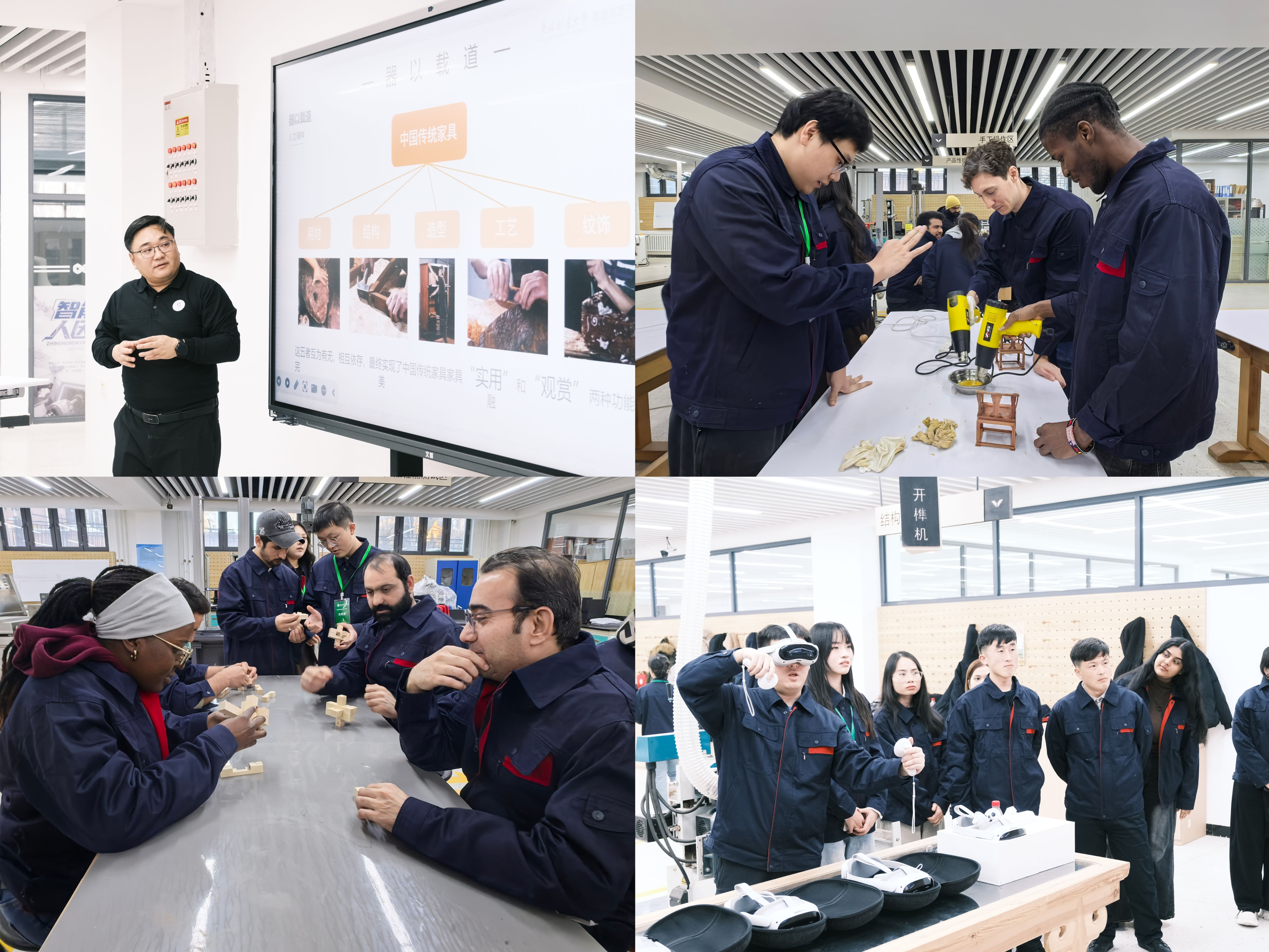 活动现场,家居学院副院长牛晓霆教授以“曲直相依、方圆共体、虚实相生、器以载道、守正创新”为脉络,深入浅出地阐释了中国传统家具美学精髓。实践环节中,VR技术带领学子们“穿越时空”触摸古今木作技艺的传承脉络;在刮磨烫蜡的细致工序里,大家体悟匠心之巧;在鲁班锁的拆解重组间,学子们共同解锁榫卯结构中的东方智慧。该院学生化身“文化使者”与“技术助理”分享木作知识、演示操作技巧,现场研讨热烈,学术氛围浓厚。语言与文化背景差异,并未阻隔彼此对木文化的热爱、对亲手创作的热忱,匠心与求知欲成为跨越国界的共通语言。